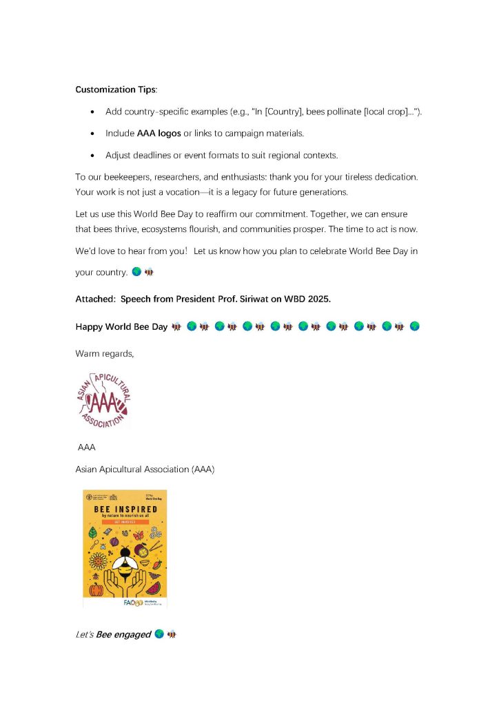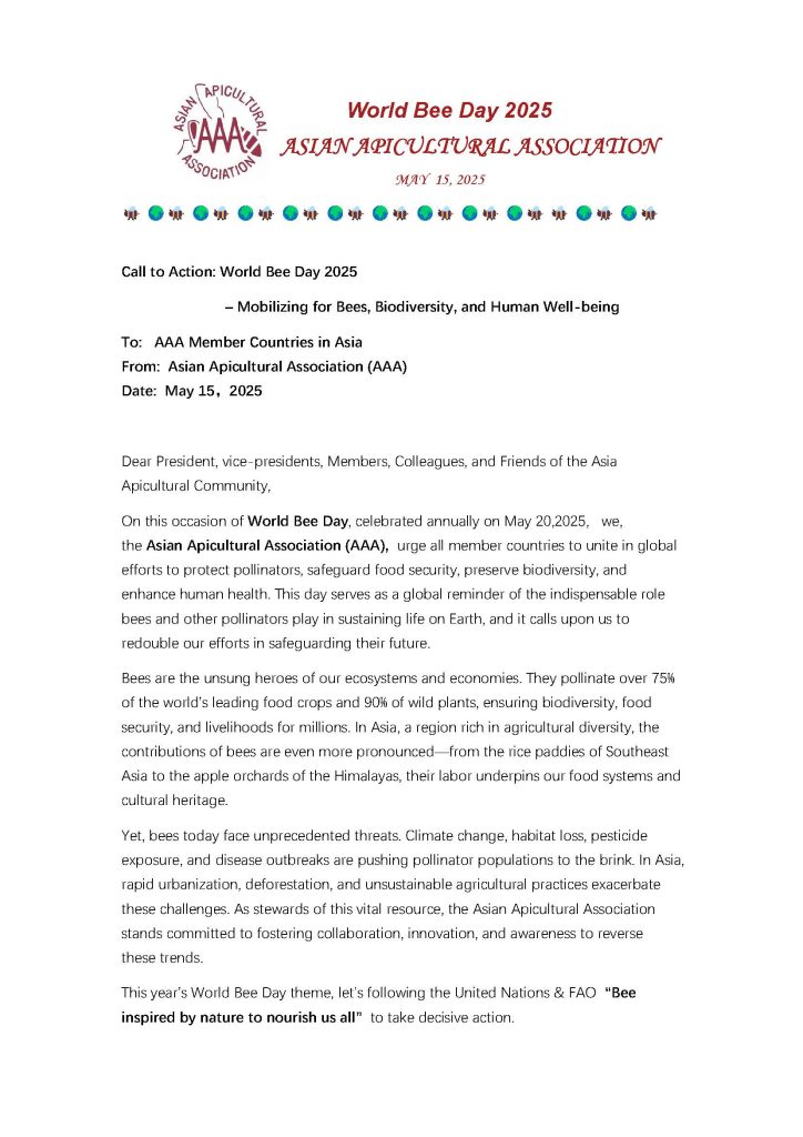 On this occasion of World Bee Day, celebrated annually on May 20.2025. we.the Asian Apicultural Association (AAA), urge all member countries to unite in globalefforts to protect pollinators, safeguard food security, preserve biodiversity, andenhance human health, This day serves as a global reminder of the indispensable rolebees and other pollinators play in sustaining life on Earth, and it calls upon us toredouble our efforts in safeguarding their future
