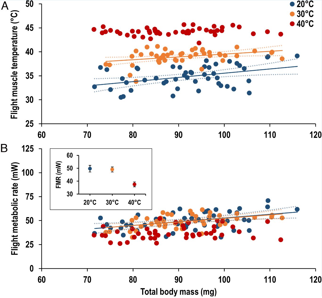 Despite the need to be able to predict the effects of climatic warming on animals, we lack methods to assess actual thermal limits of flying insects, such as pollinators. We assessed the relative danger of overheating and desiccation for honey bees carrying loads. Due to the capacity of hot bees to reduce metabolic heat production during flight, our data suggest that under dry and poor forage conditions, desiccation may limit activity before overheating, impairing critical pollination services provided by honey bees.