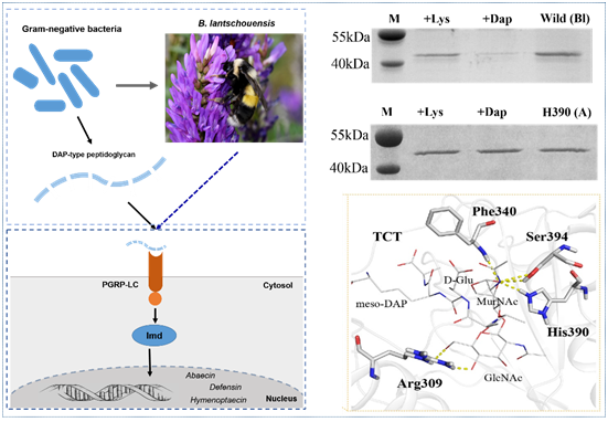 Peptidoglycan recognition proteins (PGRPs) play an important role in the defense against invading microbes via the recognition of the immunogenic substance peptidoglycan (PGN). Bees possess fewer PGRPs than Drosophila melanogaster and Anopheles gambiae but retain two important immune pathways, the Toll pathway and the Imd pathway, which can be triggered by the recognition of Dap-type PGN by PGRP-LCx with the assistance of PGRP-LCa in Drosophila. There are three isoforms of PGRP-LC including PGRP-LCx, PGRP-LCa and PGRP-LCy in Drosophila. Our previous study showed that a single PGRP-LC exists in bumblebees. In this present study, we prove that the bumblebee Bombus lantschouensis PGRP-LC (Bl-PGRP-LC) can respond to an infection with Gram-negative bacterium Escherichia coli through binding to the Dap-type PGNs directly, and that E. coli infection induces the quick and strong upregulation of PGRP-LC, abaecin and defensin. Moreover, the Bl-PGRP-LC exhibits a very strong affinity for the Dap-type PGN, much stronger than the affinity exhibited by the PGRP-LC from the more eusocial honeybee Apis mellifera (Am-PGRP-LC). In addition, mutagenesis experiments showed that the residue His390 is the anchor residue for the binding to the Dap-type PGN and forms a hydrogen bond with MurNAc rather than meso-Dap, which interacts with the anchor residue Arg413 of PGRP-LCx in Drosophila. Therefore, bumblebee PGRP-LC possesses exclusive characteristics for the immune response among insect PGRPs.